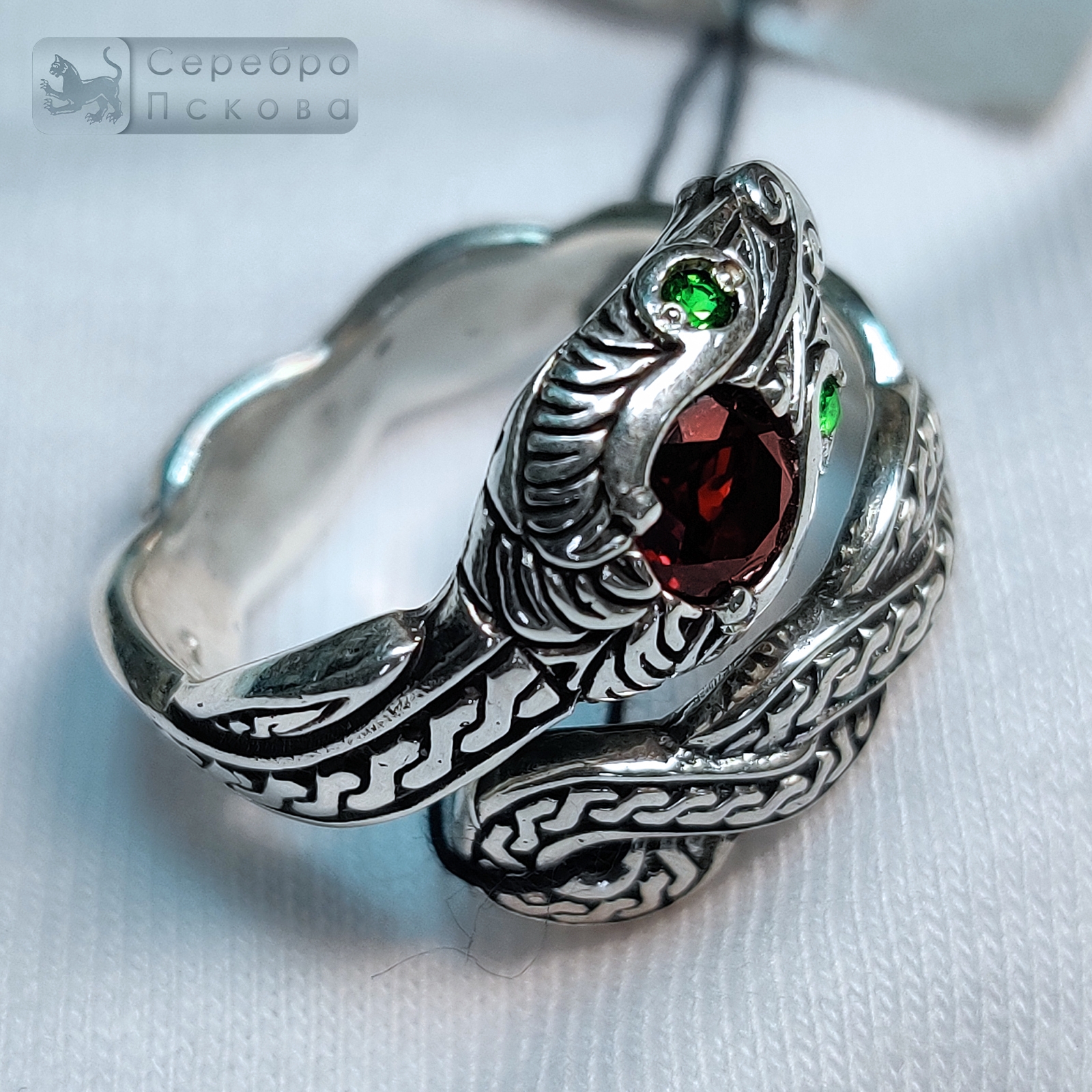 Безразмерное кольцо из серебра 925 пробы с натуральным гранатом — это завораживающее украшение, воплощающее мудрость и вечное движение жизни. Каждое изделие создается вручную, что подчеркивает его уникальность и гармоничную связь с природой. Символика образа: Змея — символ мудрости, перерождения и жизненной энергии, защитник от негативных влияний Гранат — камень страсти, силы и решимости, усиливающий внутреннюю энергию владельца Спиралевидная форма — олицетворение бесконечного цикла жизни, развития и трансформации Особенности исполнения: Гибкая безразмерная конструкция, обеспечивающая идеальную посадку на любой палец Тонкая проработка чешуи и изгибов тела змеи, создающая эффект живого движения Натуральный гранат, закрепленный в голове змеи, символизирующий мудрость и страсть Искусная ручная полировка, подчеркивающая благородство серебра и насыщенный цвет камня