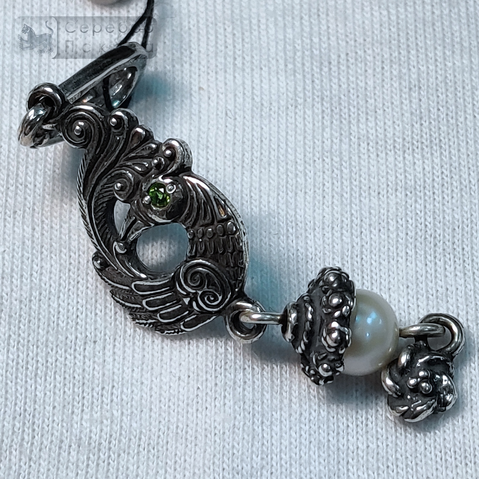 Птица счастья — один из самых добрых символов восточных славян. Её образ приносил в дом радость, благополучие, вдохновение и светлые перемены. Такие птицы встречались в вышивке, резьбе по дереву и украшениях. В подвеску бережно добавлен натуральный жемчуг, символ чистоты, женственности и гармонии. Украшение выполнено вручную псковскими мастерами из серебра 925 пробы.