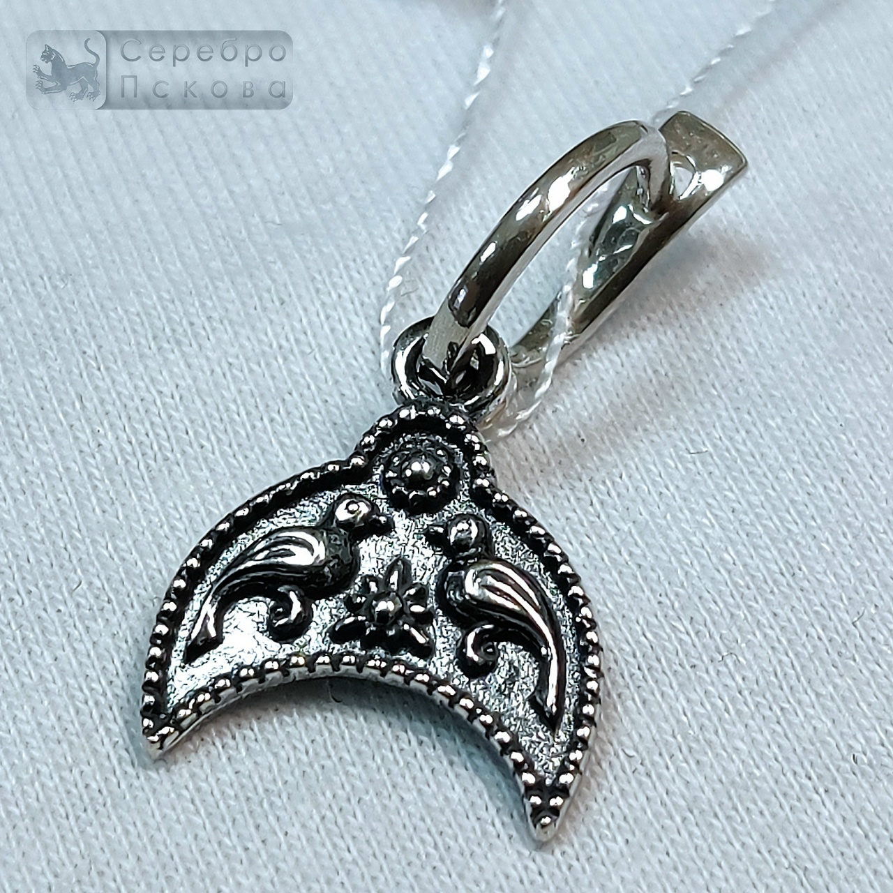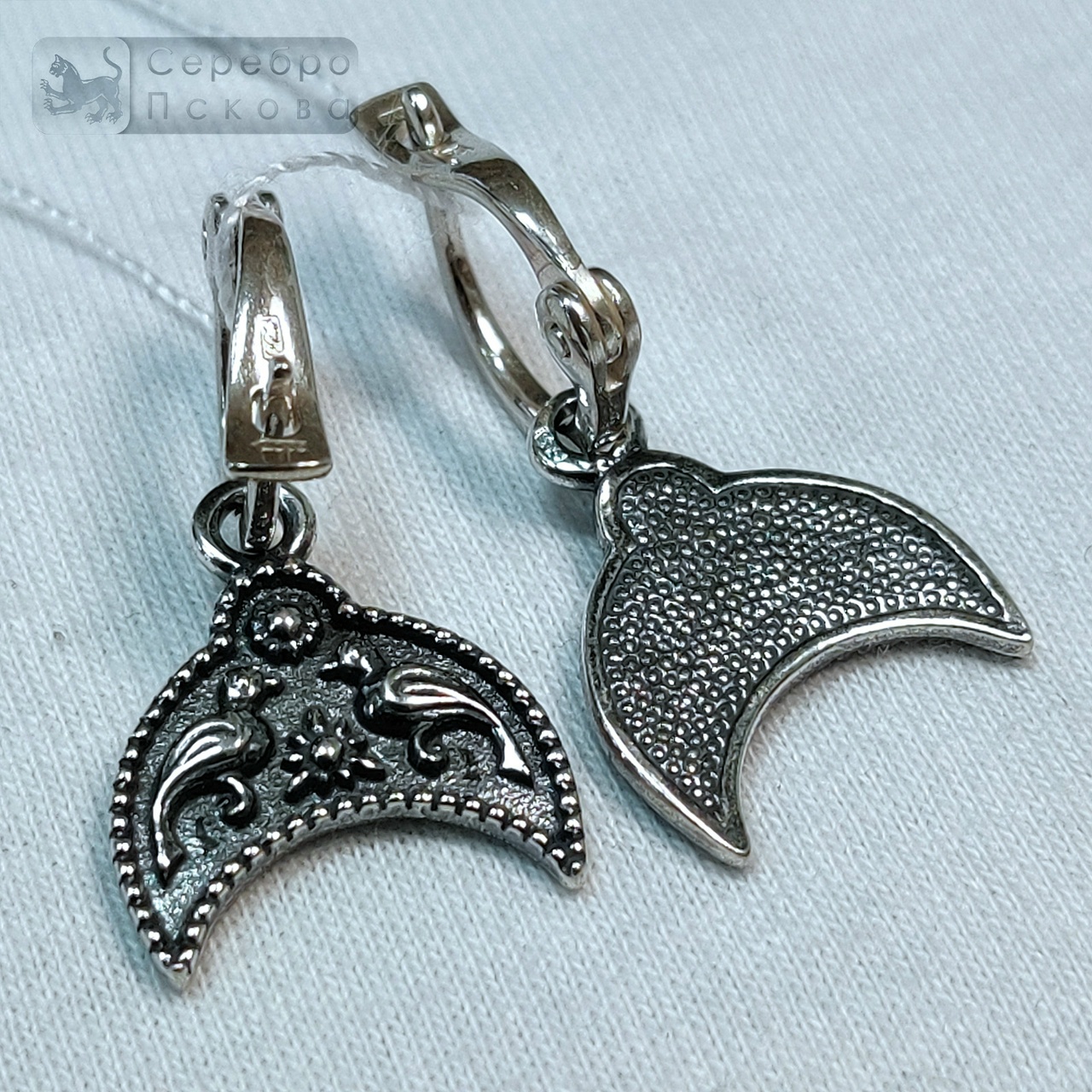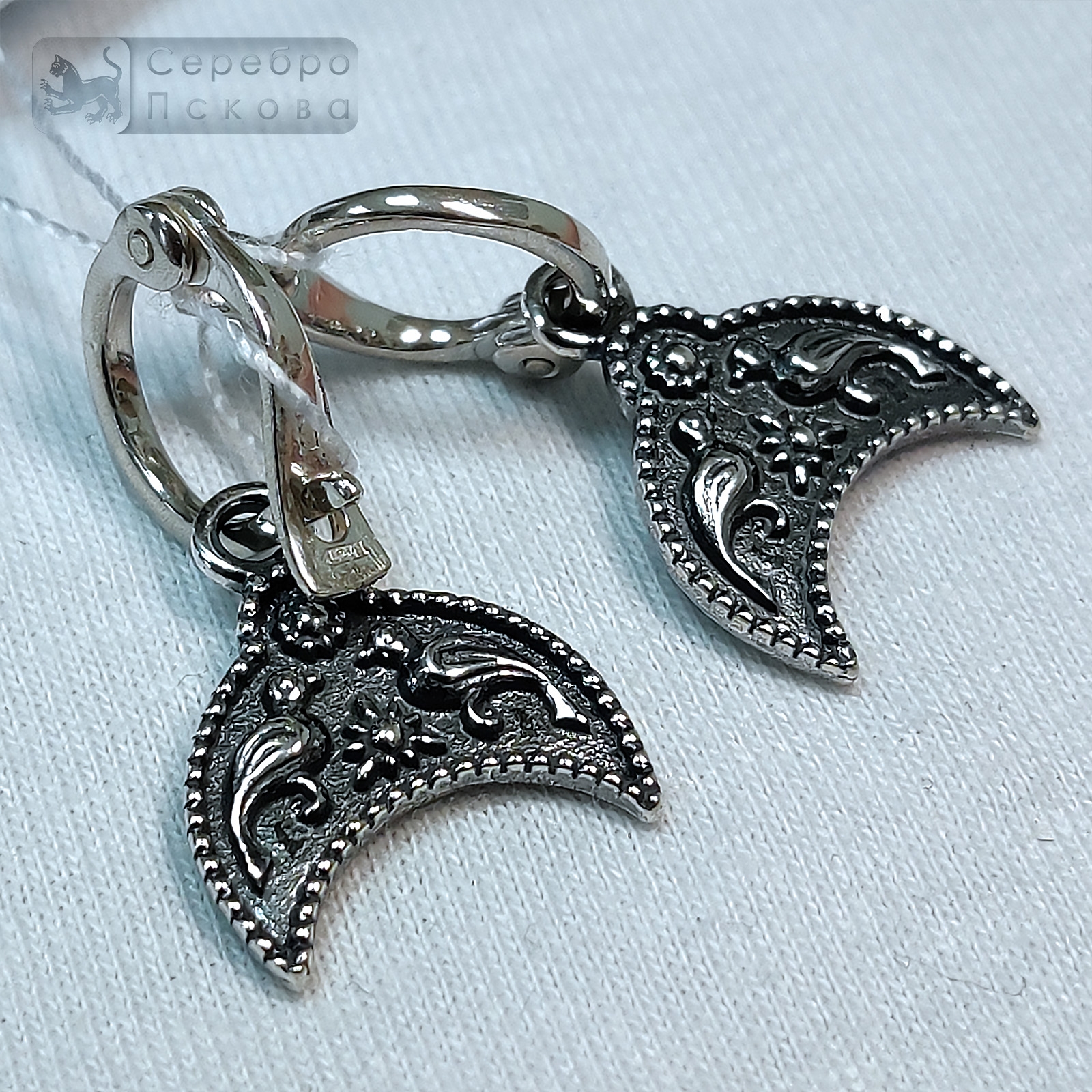 Серьги «Лунница с двумя птичками» — элегантное украшение ручной работы из серебра 925 пробы, выполненное псковскими мастерами. Орнамент сочетает древний символ лунницы — покровительницы женской силы и плодородия — с изображением двух птиц, символизирующих любовь, верность и связь души с небом. Серьги выполнены без эмали, что позволяет серебру проявить свою естественную благородную фактуру. Техника чернения подчёркивает глубину узора, а надёжный английский замок обеспечивает комфорт и безопасность при ношении.