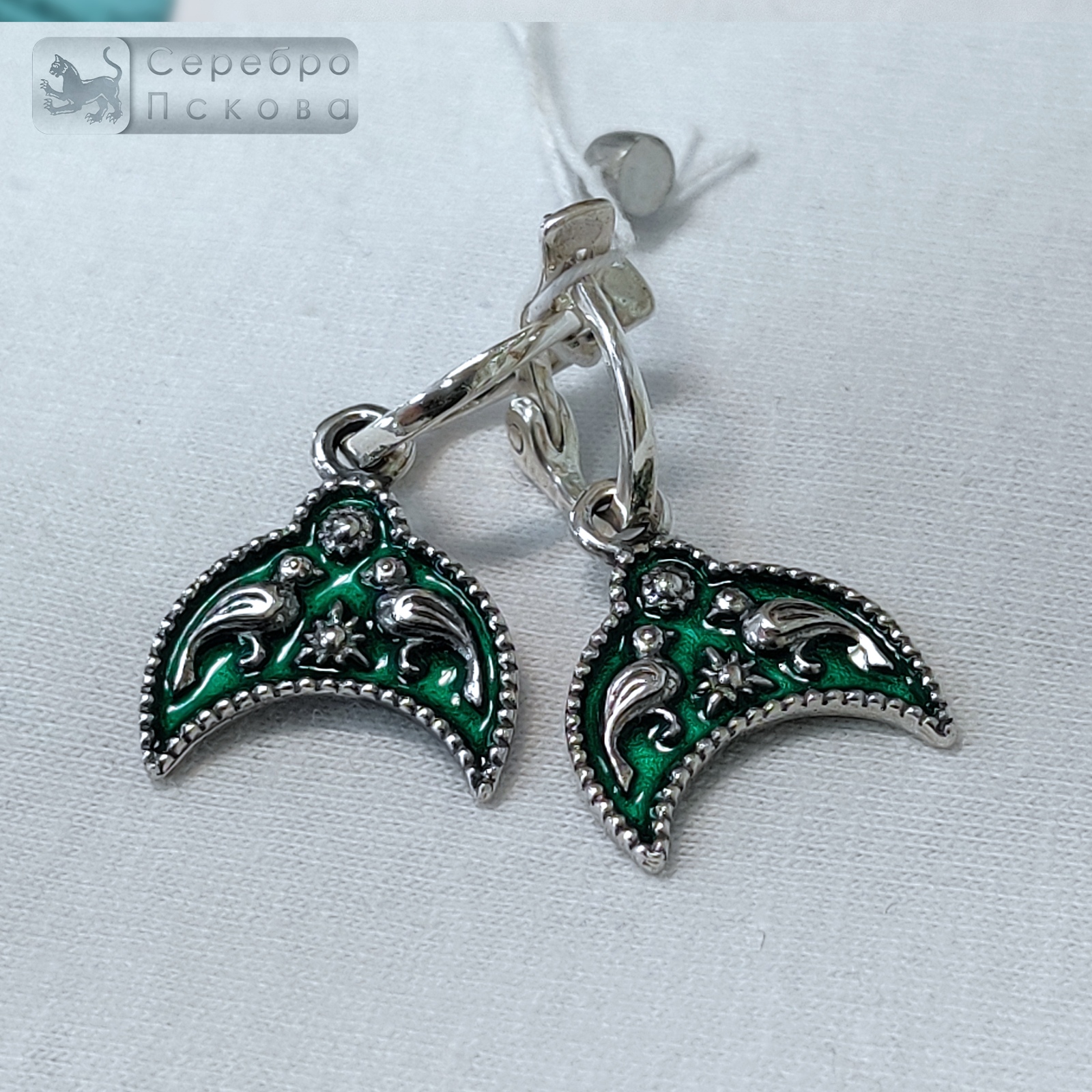 Серьги «Лунница с птичками» — уникальное украшение ручной работы от псковских мастеров, созданное из серебра 925 пробы и украшенное яркой горячей эмалью. Эти серебряные серьги воплощают древнеславянские традиции, где каждый элемент несёт глубокий символический смысл. Главный мотив — лунница с двумя птичками, символизирующая слияние двух душ, любовь, верность и гармонию. Считалось, что такой орнамент помогает найти свою пару или сохранить уже существующую связь. Каждая серьга изготавливается вручную, а нанесённая горячая эмаль придаёт рисунку насыщенность и долговечность. Украшение не тускнеет со временем, а чернение серебра подчёркивает глубину и выразительность деталей.